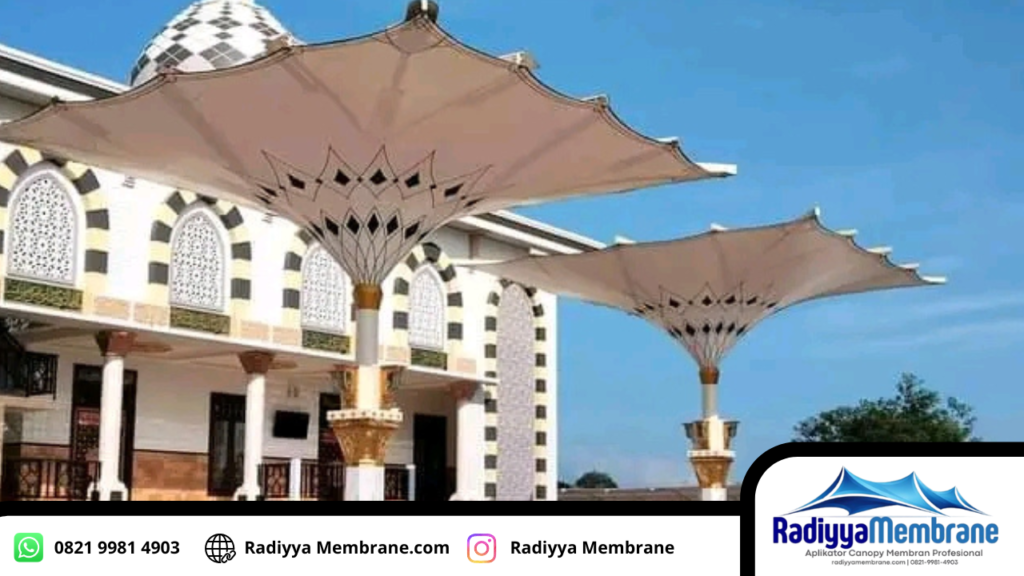 Kanopi membrane Jakarta Timur untuk masjid modern menjadi solusi ideal untuk menciptakan area teduh yang nyaman, rapi, dan tetap selaras dengan arsitektur masjid.